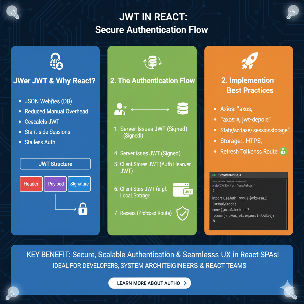 The infographic titled “JWT IN REACT: Secure Authentication Flow” provides a comprehensive technical overview of implementing JSON Web Tokens within a React application to ensure secure and scalable user sessions.