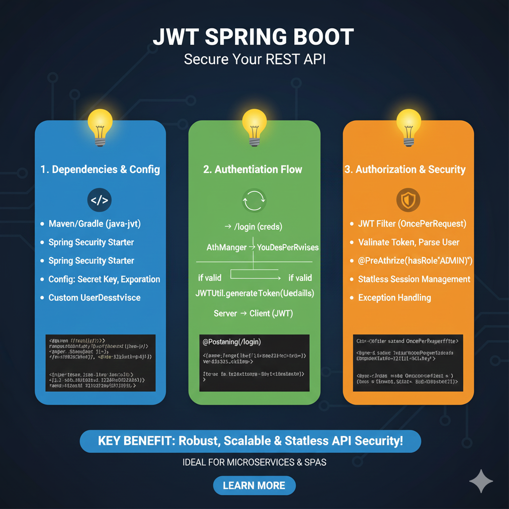 The infographic titled “JWT SPRING BOOT: Secure Your REST API” provides a high-level roadmap for integrating JSON Web Token (JWT) authentication into a Java-based microservice architecture.