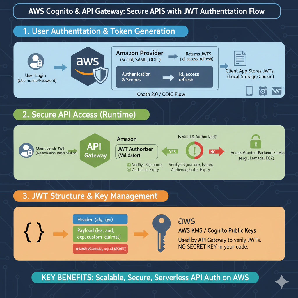 iss,aud,exp), and a Signature. - AWS KMS / Cognito Public Keys: AWS manages the public keys used by the API Gateway to verify token signatures.