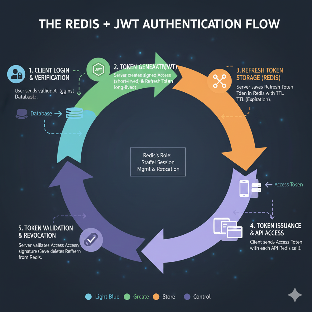The infographic outlines a five-step, color-coded process, with the central role of Redis being to provide stateful session management and revocation.